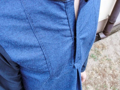 Całość została oparta na wykroju z Burdy (Rustic Worker's Shirt 12/2012 #142). Pomysł zaczął się od kawałka koszulowego jeansu, który zalegał w szafie. Postanowiłam połączyć go z resztkami granatowego bawełnianego jerseyu. Niestety, jeansu wciąż było troszkę za mało, stąd pomysł na kontrafałdę z przodu (okazało się, że nijak nie uda mi się wyciąć karczka z zapasem na szwy). Stąd też brak stójki, podkrój szyi został wykończony czarną taśmą rypsową, co też wygląda nieźle, szczególnie, że jeans to melanż granatu i niewielkiej domieszki czerni. Ogólnie szyło się całkiem nieźle. Ponieważ S. twierdzi, ze mu troszkę ciasno, jak się zapnie pod szyję, zrezygnowałam (z ulgą, nienawidzę robienia dziurek) z guzików na rzecz jednego zatrzasku.